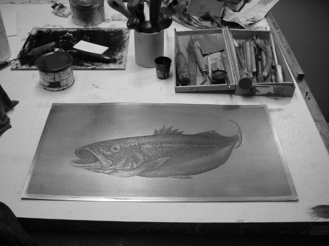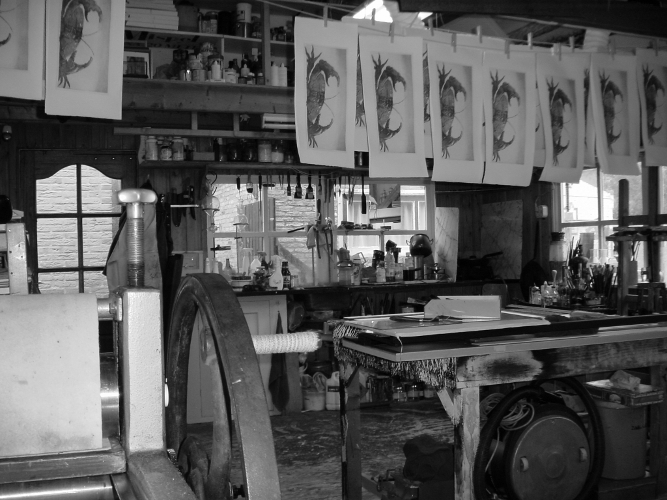 | DE TECHNIEK VAN HET ETSEN Op een zorgvuldig gepolijste plaat van koper of zink.......... ![]() ......wordt een zuurbestendige laag aangebracht: ![]() In deze laag wordt in spiegelbeeld met een etsnaald een afbeelding getekend. ![]() De hierdoor bloot liggende lijnen worden uitgebeten door de plaat in een zuurbad te leggen. Hoe langer hoe dieper de lijn en donkerder de afdruk wordt. ![]() Voor de grijstinten, de z.g. aquatint, worden zeer kleine harskorreltjes op de plaat gesmolten. ![]() ![]() Voor het wit en de grijstinten worden delen in verschillende fasen afgedekt: ![]() De uitgebeten dieper liggende afbeelding wordt vervolgens gevuld met drukinkt waarna de plaat samen met handgeschept en vochtig gemaakt papier door de etspers wordt gehaald. Na het uitvlakken tussen twee platen marmer worden de etsen linksonder genummerd: het aantal afdrukken en het unieke nummer van de ets. De etspers is gemaakt door Haarsma in opdracht en naar ontwerpvan meesterschilder Gerrit Ris (1931-1998) uit Smalle Ee in Friesland. Na het persen worden de etsen opgehangen om te drogen. Daarna worden ze linksonder genummerd: de oplage/en het unieke nummer. |